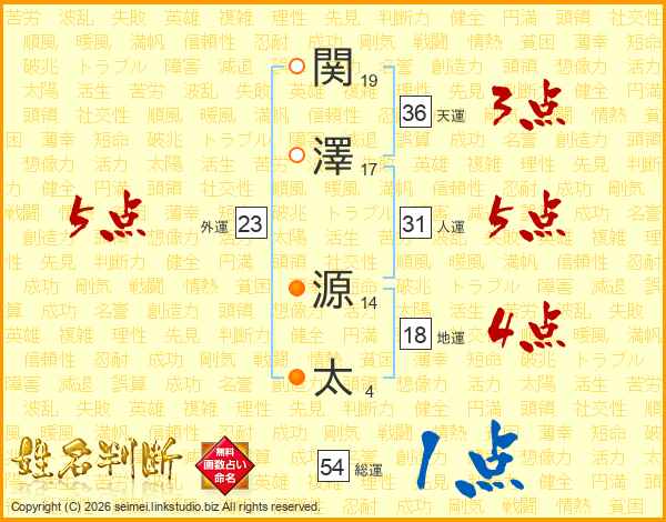 関(19画)澤(17画) 源(14画)太(4画)