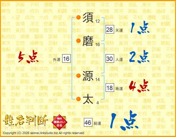 あなたの人生を表す1番重要な運勢です。生涯を通じて影響する総合運となり、主に50歳以降の晩年期に影響を及ぼします。苗字と名前の合計画数。