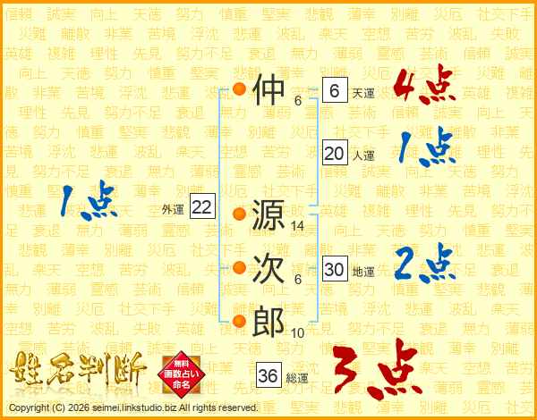 生活面を象徴する運勢です。外部から受ける影響力を表し、結婚運、家庭運や職場、環境への順応性を表します。総運から人運を引いた画数。姓や名が1文字の場合を除く。