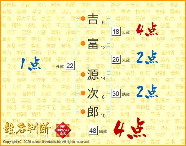 吉(6画)富(12画) 源(14画)次(6画)郎(10画)