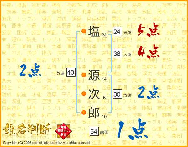 塩源次郎さんの総運は54画の1点!
