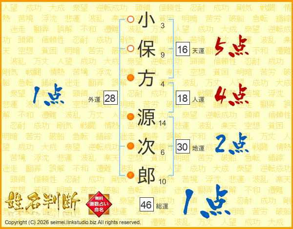 小(3画)保(9画)方(4画) 源(14画)次(6画)郎(10画)