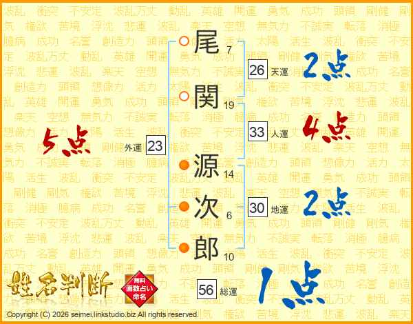 尾(7画)関(19画) 源(14画)次(6画)郎(10画)
