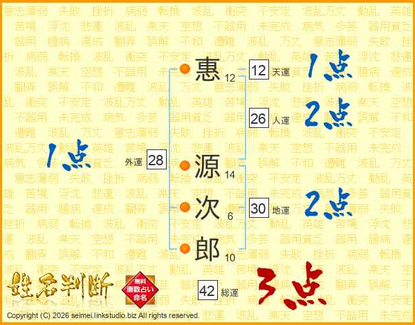 惠源次郎さんの人運は26画の2点!
