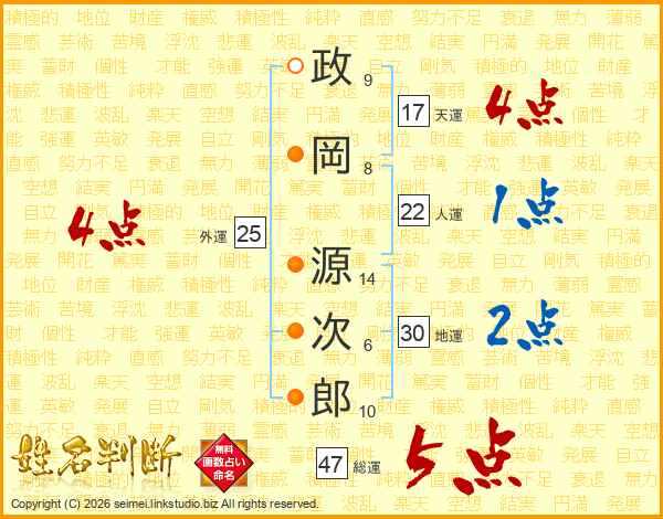 政(9画)岡(8画) 源(14画)次(6画)郎(10画)