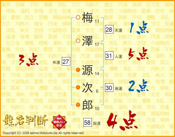 梅(11画)澤(17画) 源(14画)次(6画)郎(10画)