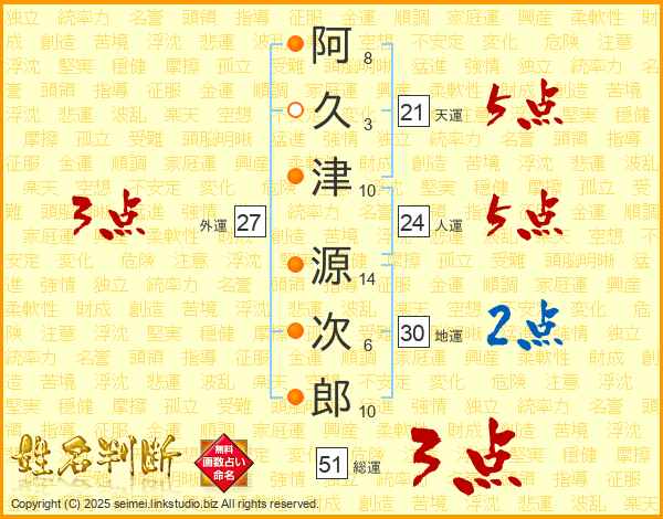 阿(8画)久(3画)津(10画) 源(14画)次(6画)郎(10画)