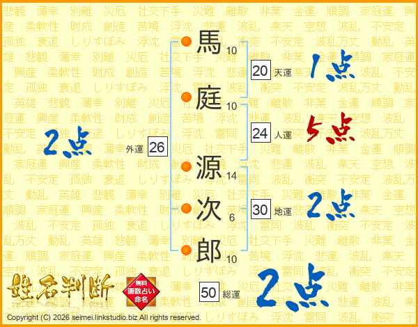 馬(10画)庭(10画) 源(14画)次(6画)郎(10画)