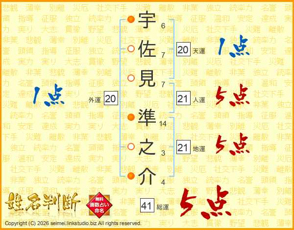 宇(6画)佐(7画)見(7画) 準(14画)之(3画)介(4画)