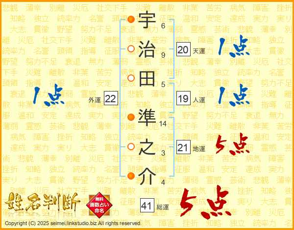 宇(6画)治(9画)田(5画) 準(14画)之(3画)介(4画)