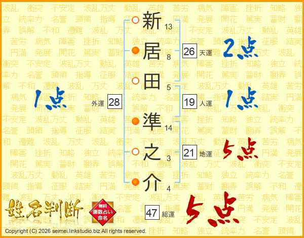 新(13画)居(8画)田(5画) 準(14画)之(3画)介(4画)