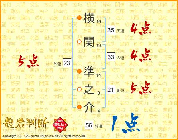 横(16画)関(19画) 準(14画)之(3画)介(4画)