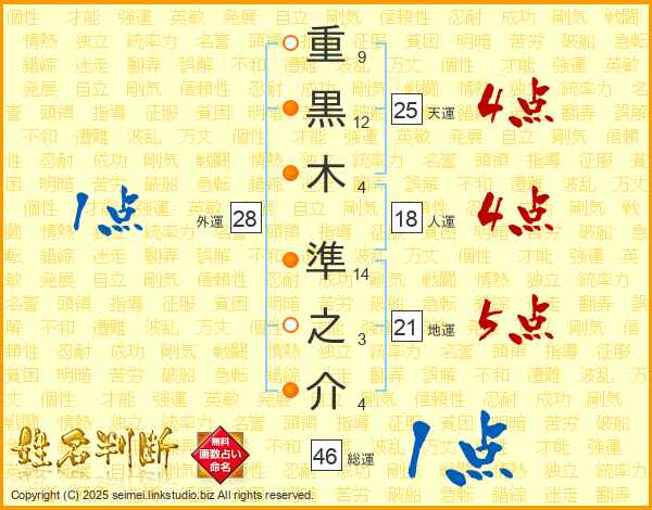 重(9画)黒(12画)木(4画) 準(14画)之(3画)介(4画)