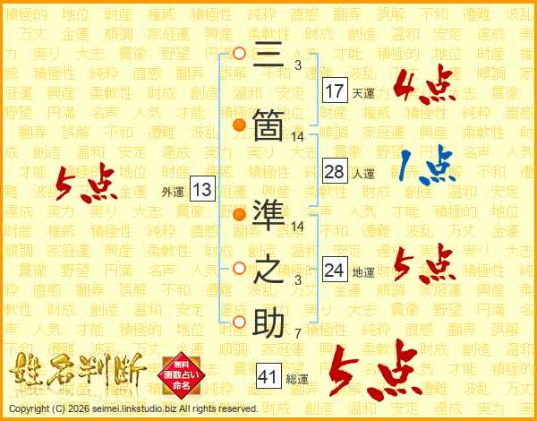 生活面を象徴する運勢です。外部から受ける影響力を表し、結婚運、家庭運や職場、環境への順応性を表します。総運から人運を引いた画数。姓や名が1文字の場合を除く。