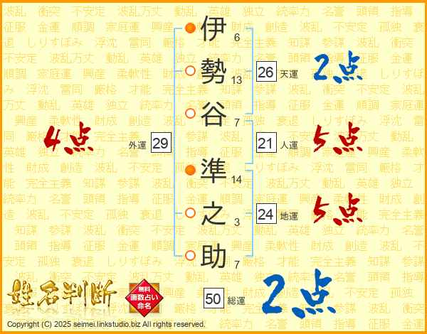 伊(6画)勢(13画)谷(7画) 準(14画)之(3画)助(7画)