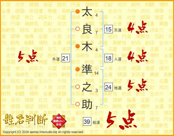 太(4画)良(7画)木(4画) 準(14画)之(3画)助(7画)