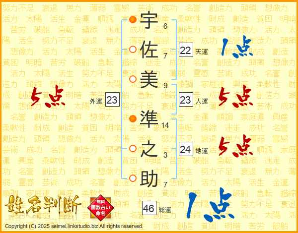 宇(6画)佐(7画)美(9画) 準(14画)之(3画)助(7画)