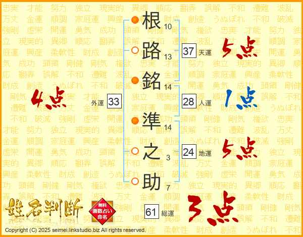 根(10画)路(13画)銘(14画) 準(14画)之(3画)助(7画)