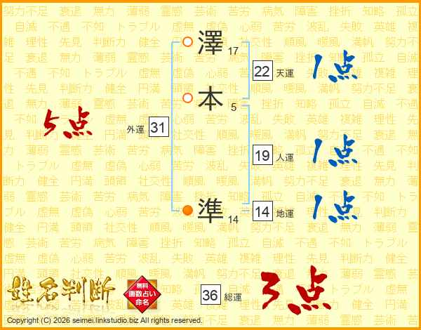 生活面を象徴する運勢です。外部から受ける影響力を表し、結婚運、家庭運や職場、環境への順応性を表します。総運から人運を引いた画数。姓や名が1文字の場合を除く。