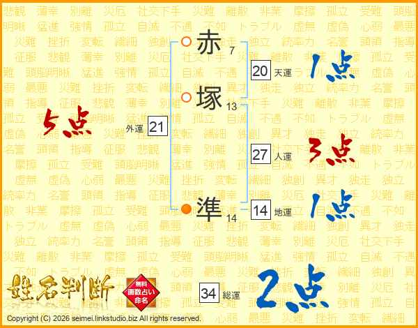 赤(7画)塚(13画) 準(14画)