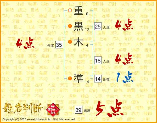 家系が持つ宿命的な運勢を表します。祖先から受け継いだ苗字ですので自分の力が及びません。家柄を象徴します。苗字の合計画数。