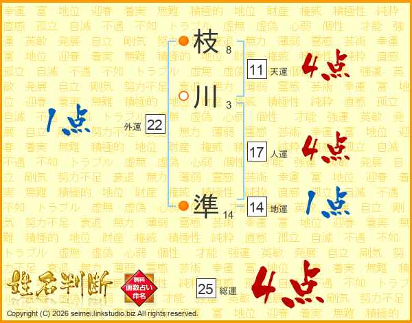 生活面を象徴する運勢です。外部から受ける影響力を表し、結婚運、家庭運や職場、環境への順応性を表します。総運から人運を引いた画数。姓や名が1文字の場合を除く。