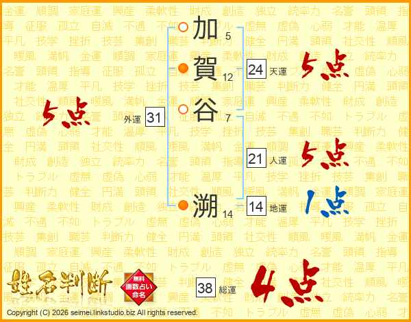加賀谷溯さんの総運は38画の4点!