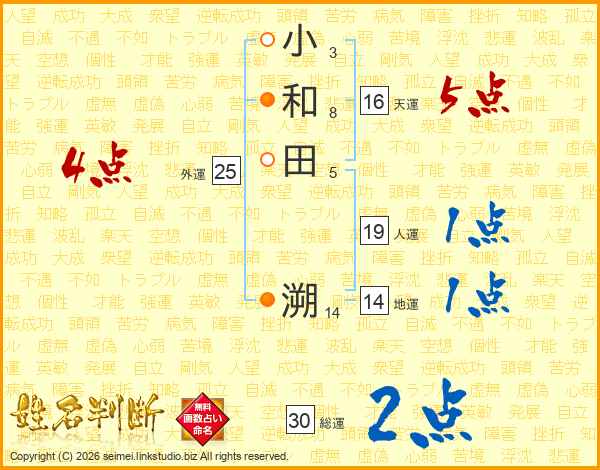 生活面を象徴する運勢です。外部から受ける影響力を表し、結婚運、家庭運や職場、環境への順応性を表します。総運から人運を引いた画数。姓や名が1文字の場合を除く。