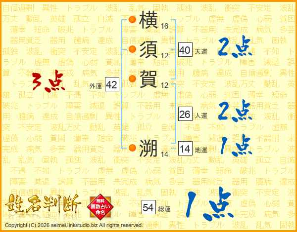 生活面を象徴する運勢です。外部から受ける影響力を表し、結婚運、家庭運や職場、環境への順応性を表します。総運から人運を引いた画数。姓や名が1文字の場合を除く。
