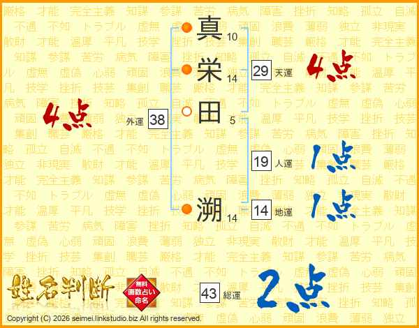 生活面を象徴する運勢です。外部から受ける影響力を表し、結婚運、家庭運や職場、環境への順応性を表します。総運から人運を引いた画数。姓や名が1文字の場合を除く。