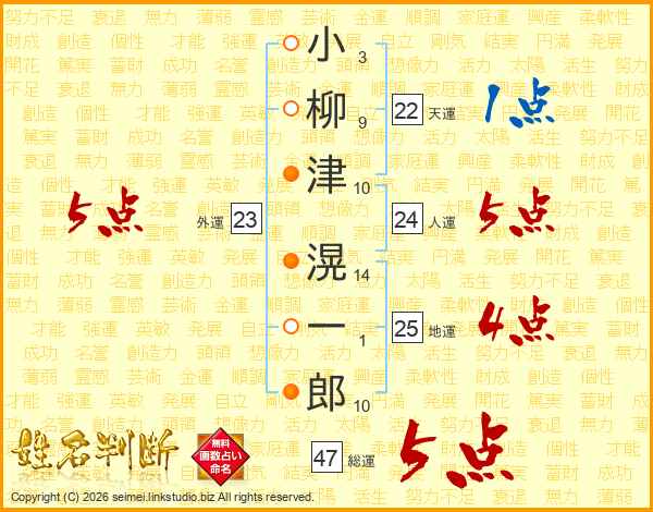 小(3画)柳(9画)津(10画) 滉(14画)一(1画)郎(10画)