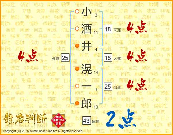 小(3画)酒(11画)井(4画) 滉(14画)一(1画)郎(10画)