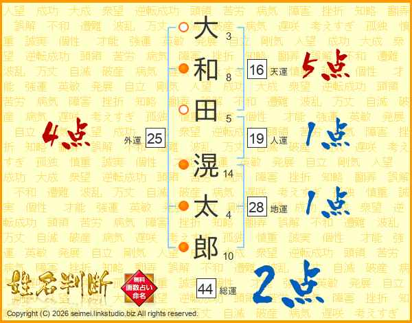 大(3画)和(8画)田(5画) 滉(14画)太(4画)郎(10画)