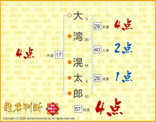 大(3画)湾(26画) 滉(14画)太(4画)郎(10画)
