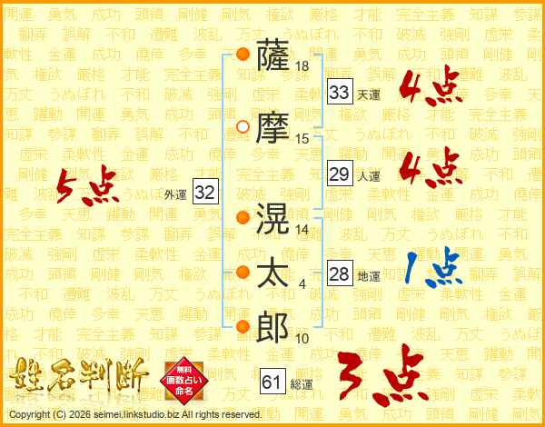 薩(18画)摩(15画) 滉(14画)太(4画)郎(10画)