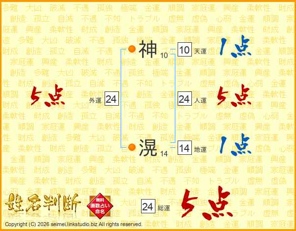 生活面を象徴する運勢です。外部から受ける影響力を表し、結婚運、家庭運や職場、環境への順応性を表します。総運から人運を引いた画数。姓や名が1文字の場合を除く。