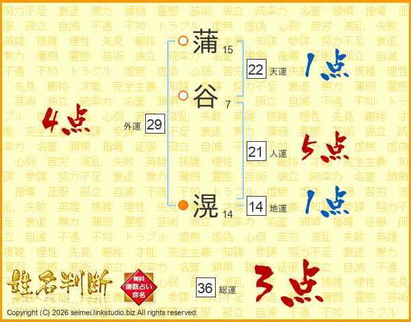 生活面を象徴する運勢です。外部から受ける影響力を表し、結婚運、家庭運や職場、環境への順応性を表します。総運から人運を引いた画数。姓や名が1文字の場合を除く。