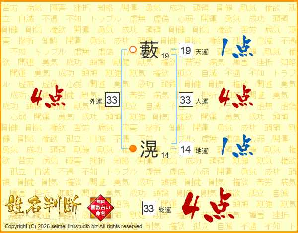 生活面を象徴する運勢です。外部から受ける影響力を表し、結婚運、家庭運や職場、環境への順応性を表します。総運から人運を引いた画数。姓や名が1文字の場合を除く。