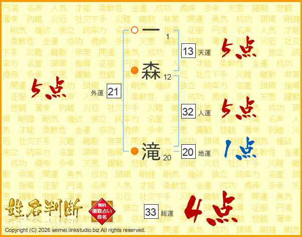 生活面を象徴する運勢です。外部から受ける影響力を表し、結婚運、家庭運や職場、環境への順応性を表します。総運から人運を引いた画数。姓や名が1文字の場合を除く。
