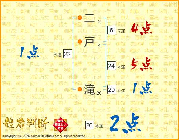 家系が持つ宿命的な運勢を表します。祖先から受け継いだ苗字ですので自分の力が及びません。家柄を象徴します。苗字の合計画数。