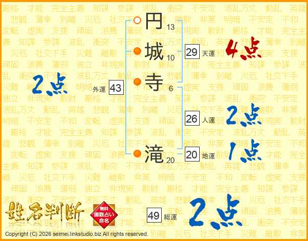 生活面を象徴する運勢です。外部から受ける影響力を表し、結婚運、家庭運や職場、環境への順応性を表します。総運から人運を引いた画数。姓や名が1文字の場合を除く。