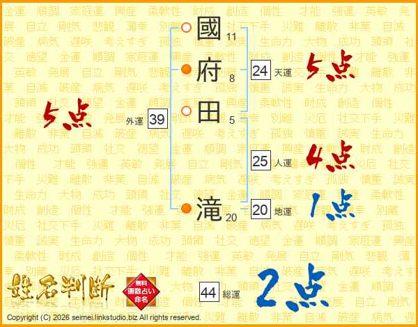 家系が持つ宿命的な運勢を表します。祖先から受け継いだ苗字ですので自分の力が及びません。家柄を象徴します。苗字の合計画数。