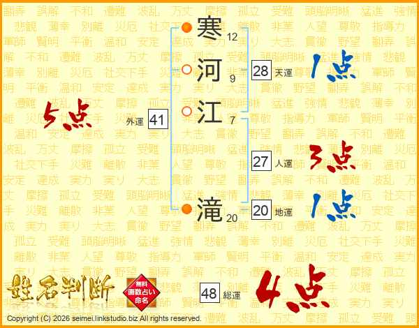 生活面を象徴する運勢です。外部から受ける影響力を表し、結婚運、家庭運や職場、環境への順応性を表します。総運から人運を引いた画数。姓や名が1文字の場合を除く。