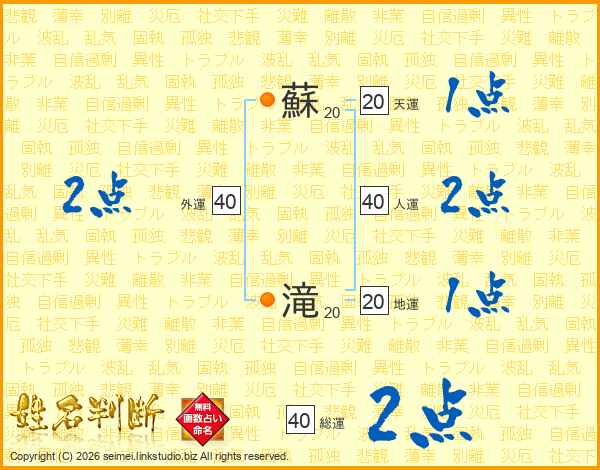 生活面を象徴する運勢です。外部から受ける影響力を表し、結婚運、家庭運や職場、環境への順応性を表します。総運から人運を引いた画数。姓や名が1文字の場合を除く。