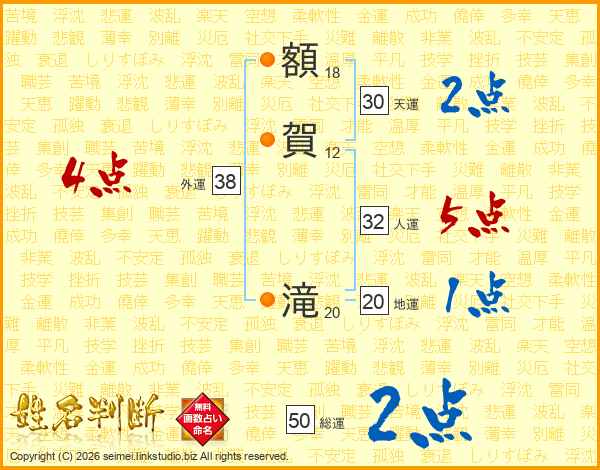 額(18画)賀(12画) 滝(20画)