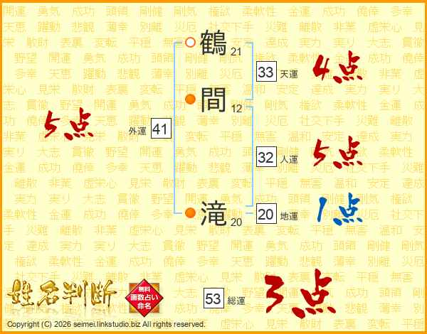 あなたの人生を表す1番重要な運勢です。生涯を通じて影響する総合運となり、主に50歳以降の晩年期に影響を及ぼします。苗字と名前の合計画数。