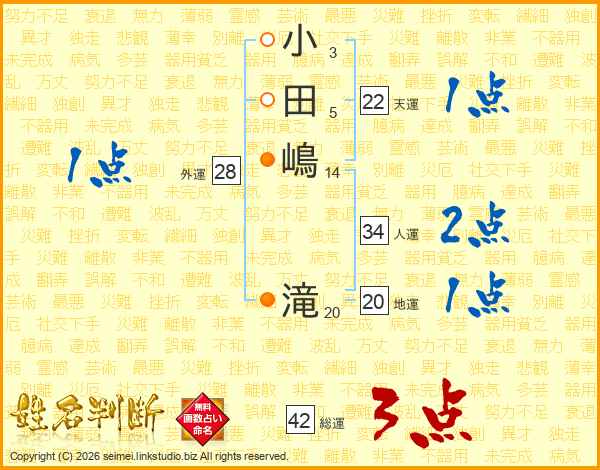 小(3画)田(5画)嶋(14画) 滝(20画)
