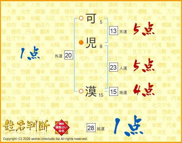 生活面を象徴する運勢です。外部から受ける影響力を表し、結婚運、家庭運や職場、環境への順応性を表します。総運から人運を引いた画数。姓や名が1文字の場合を除く。