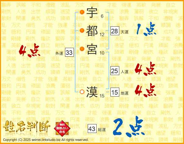 宇都宮漠さんの総運は43画の2点!