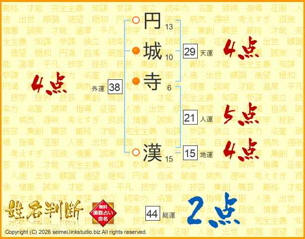 生活面を象徴する運勢です。外部から受ける影響力を表し、結婚運、家庭運や職場、環境への順応性を表します。総運から人運を引いた画数。姓や名が1文字の場合を除く。